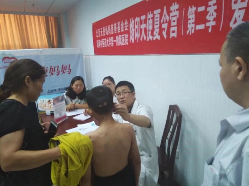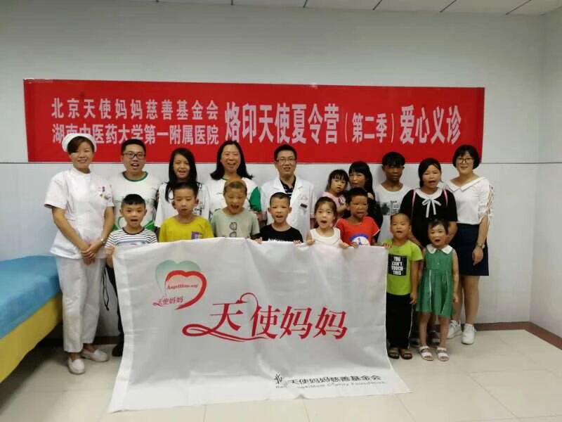 2018年7月23日,天使妈妈基金会在湖南中医药大学第一附属医院举行“烙印天使”义诊活动,来自湖南省内的10余名烧烫伤患儿参加义诊,湖南中医药大学第一附属医院烧伤科主任周忠志教授带领医疗团队为孩子们免费进行复查,赠送药品,关注孩子的康复进展。
